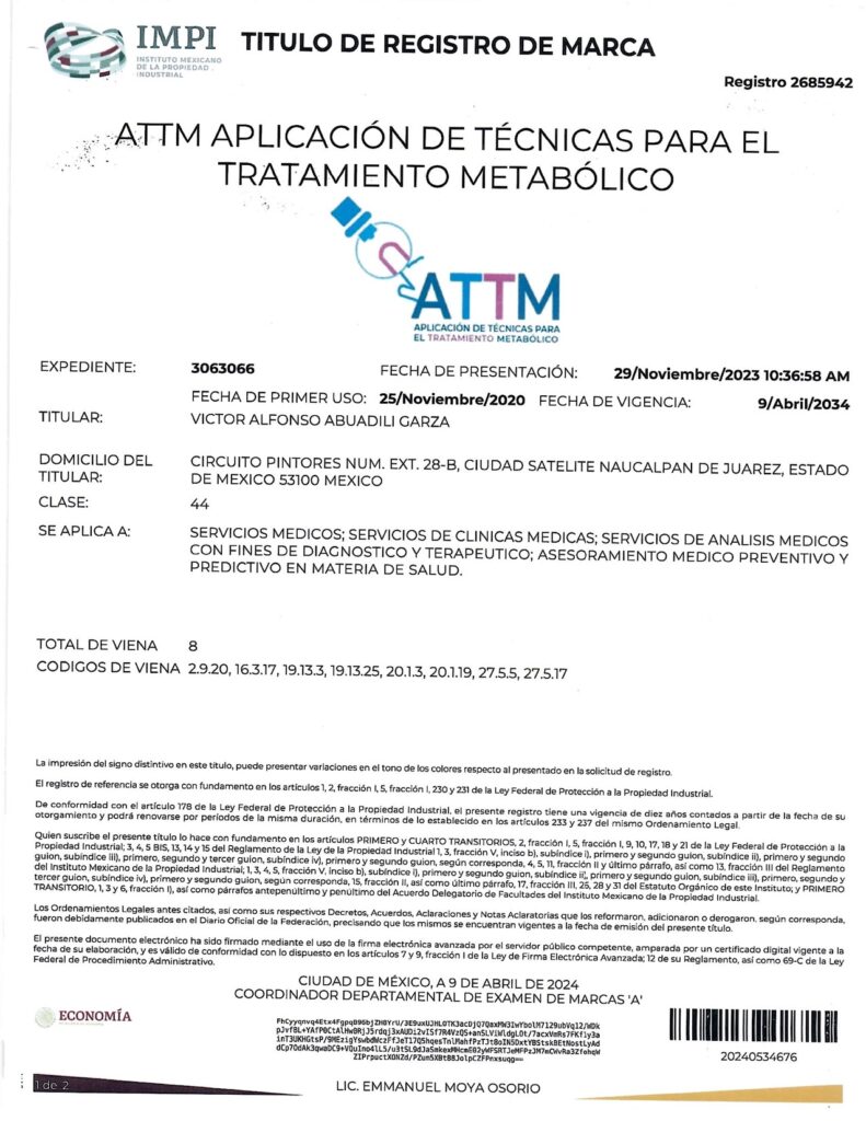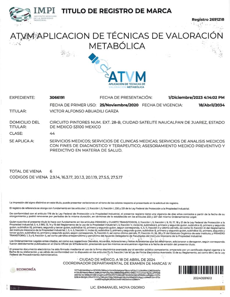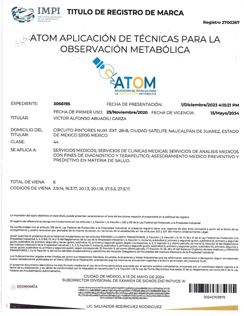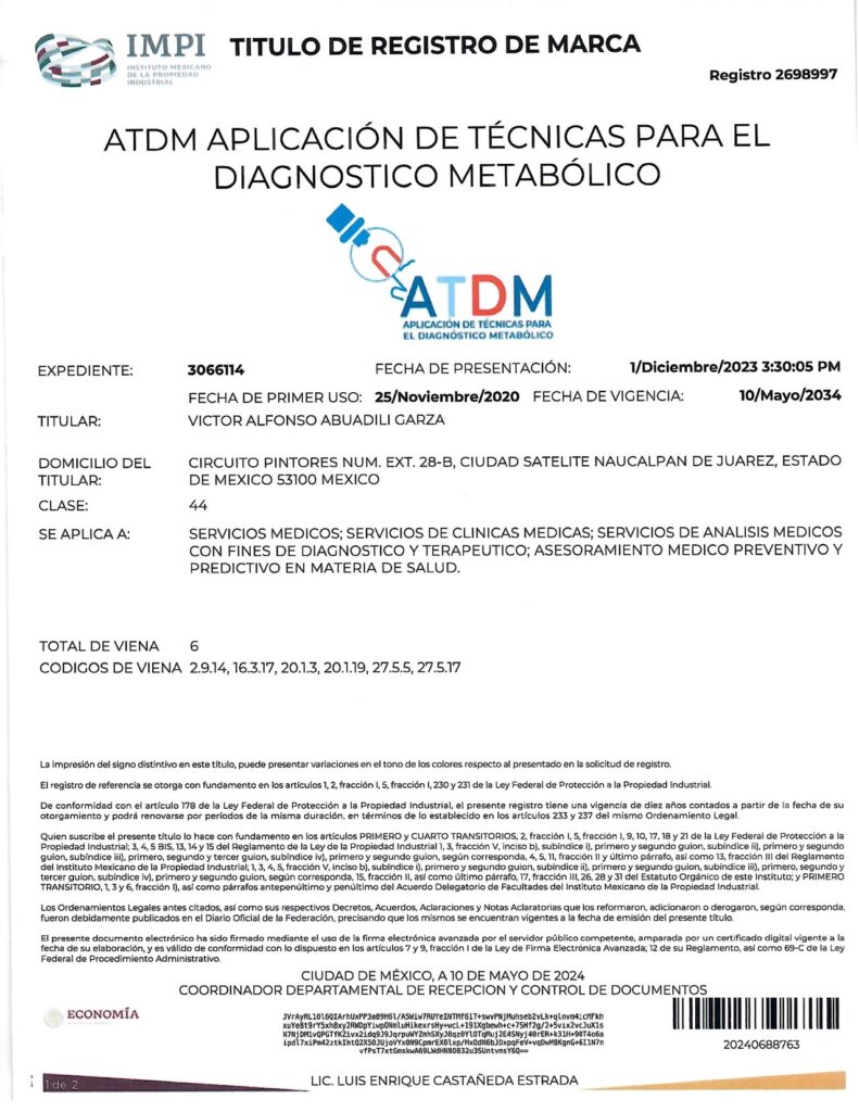 - CON EL REGISTRO 2683485 EN EL EXPEDIENTE 3060756 DEL IMPI, CUYO TITULAR ES: VICTOR ALFONSO ABUADILI GARZA, SE REGISTRA EL SISTEMA DE APLICACIÓN DE TÉCNICAS PARA EL DIAGNÓSTICO METABÓLICO (SISTEMA ATDM) EN LA CATEGORÍA 44: “SERVICIOS MEDICOS; SERVICIOS DE CLINICAS MEDICAS; SERVICIOS DE ANALISIS MEDICOS CON FINES DE DIAGNOSTICO Y TERAPEUTICO; ASESORAMIENTO MEDICO PREVENTIVO Y PREDICTIVO EN MATERIA DE SALUD”.