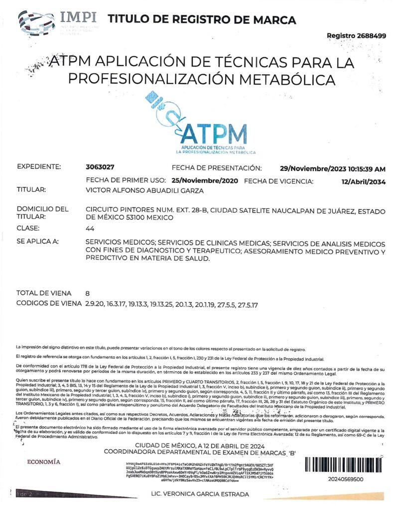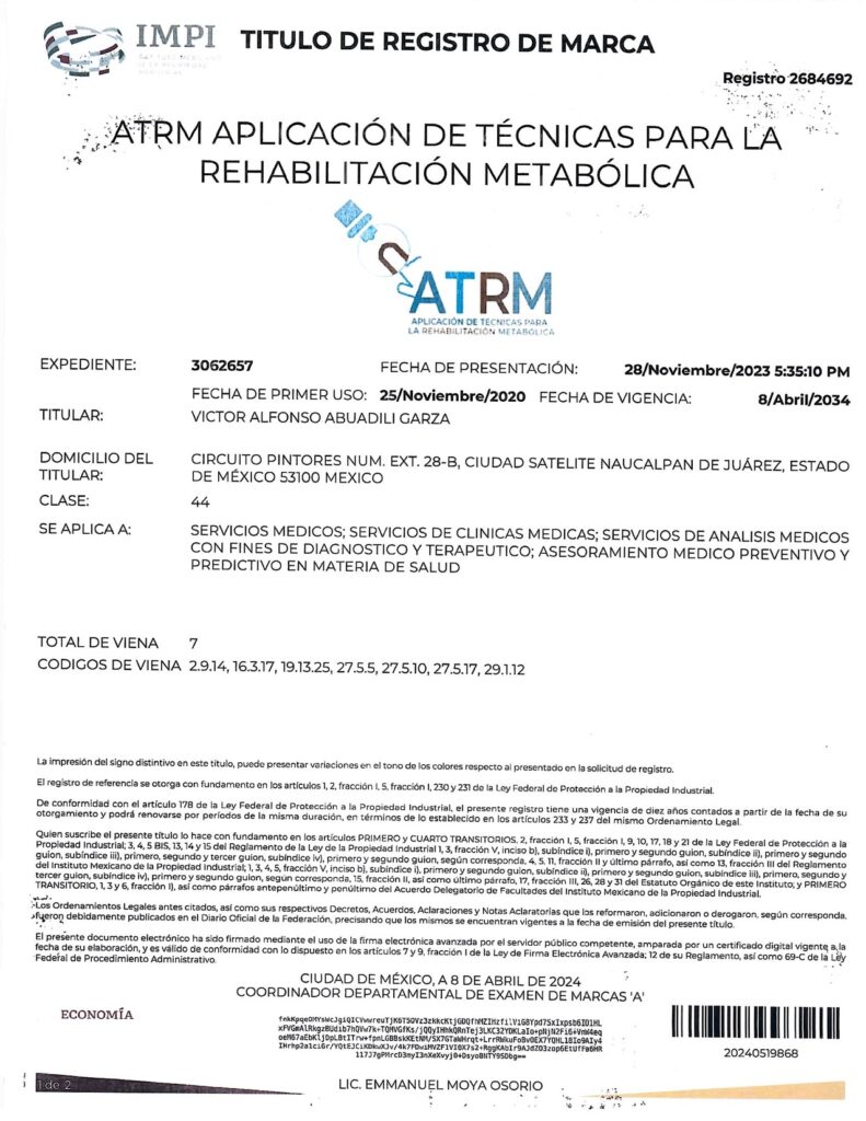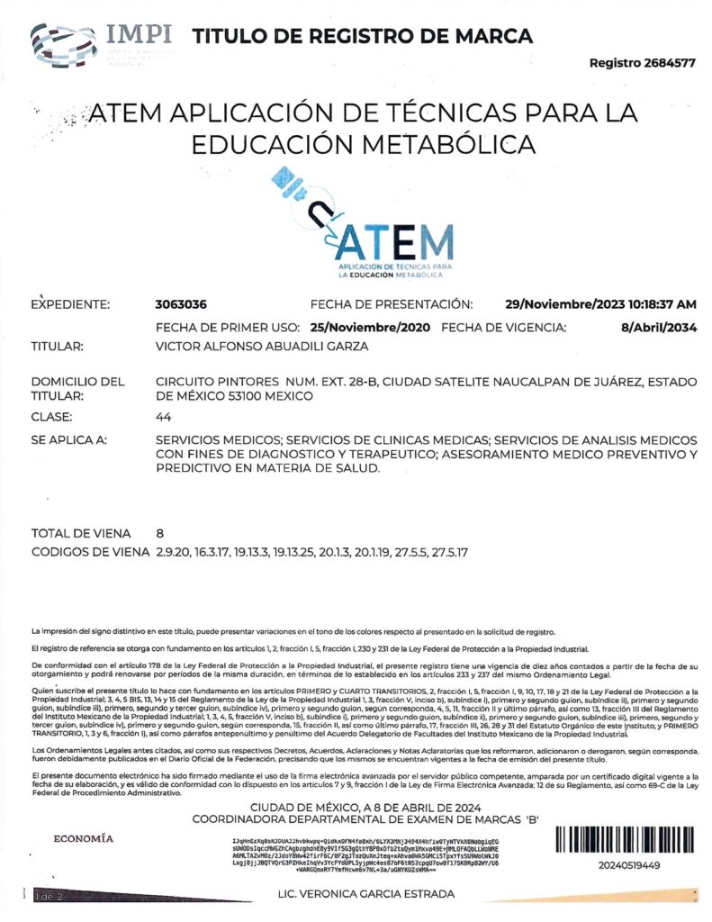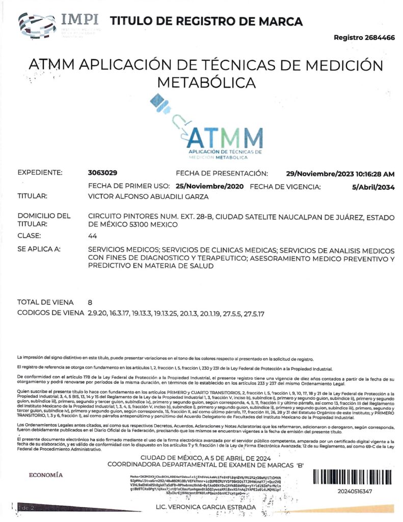 - CON EL REGISTRO 2683485 EN EL EXPEDIENTE 3060756 DEL IMPI, CUYO TITULAR ES: VICTOR ALFONSO ABUADILI GARZA, SE REGISTRA EL SISTEMA DE APLICACIÓN DE TÉCNICAS PARA EL DIAGNÓSTICO METABÓLICO (SISTEMA ATDM) EN LA CATEGORÍA 44: “SERVICIOS MEDICOS; SERVICIOS DE CLINICAS MEDICAS; SERVICIOS DE ANALISIS MEDICOS CON FINES DE DIAGNOSTICO Y TERAPEUTICO; ASESORAMIENTO MEDICO PREVENTIVO Y PREDICTIVO EN MATERIA DE SALUD”.