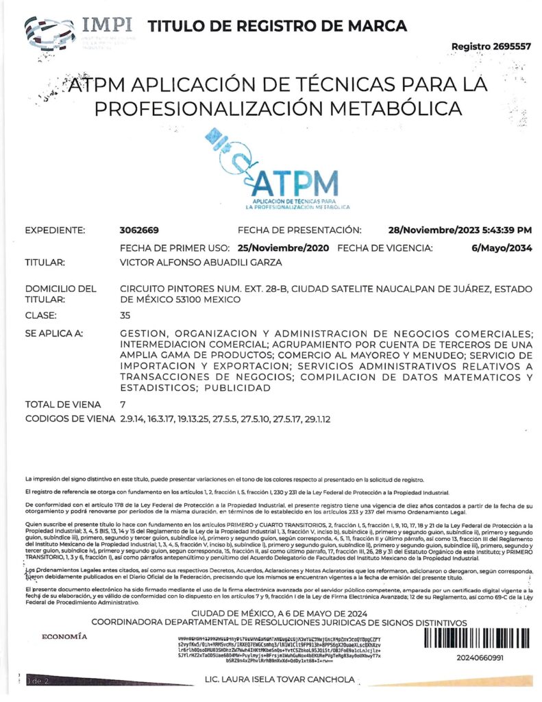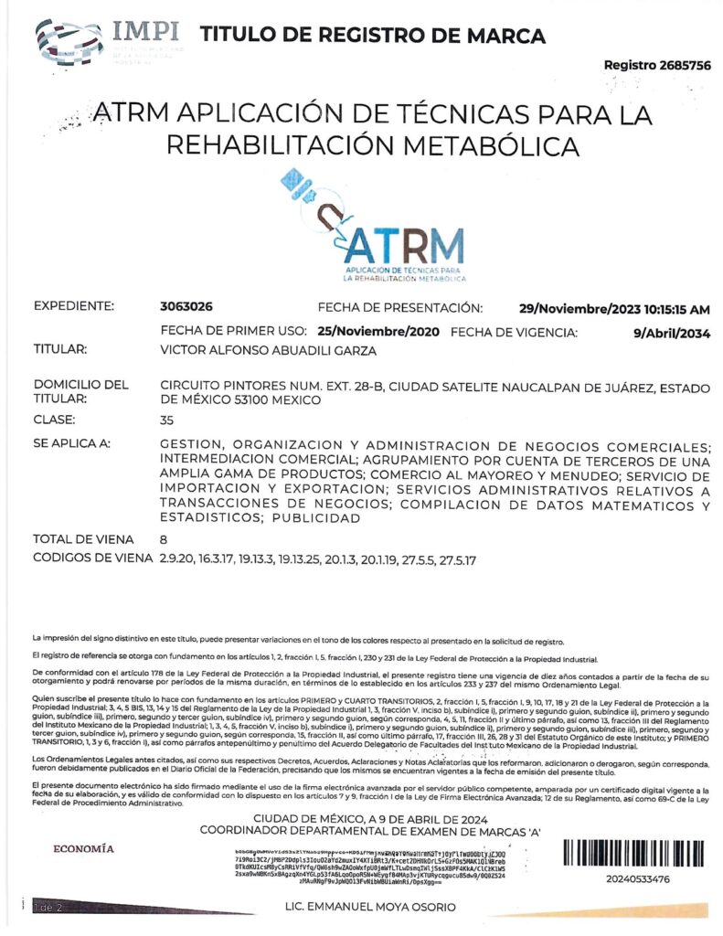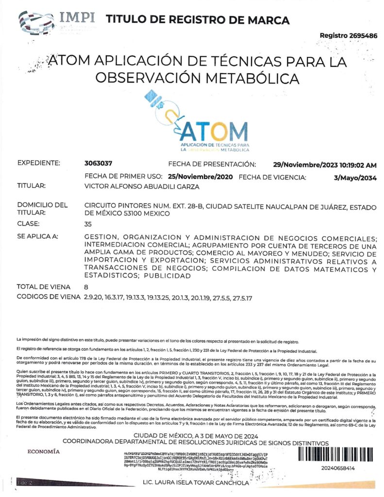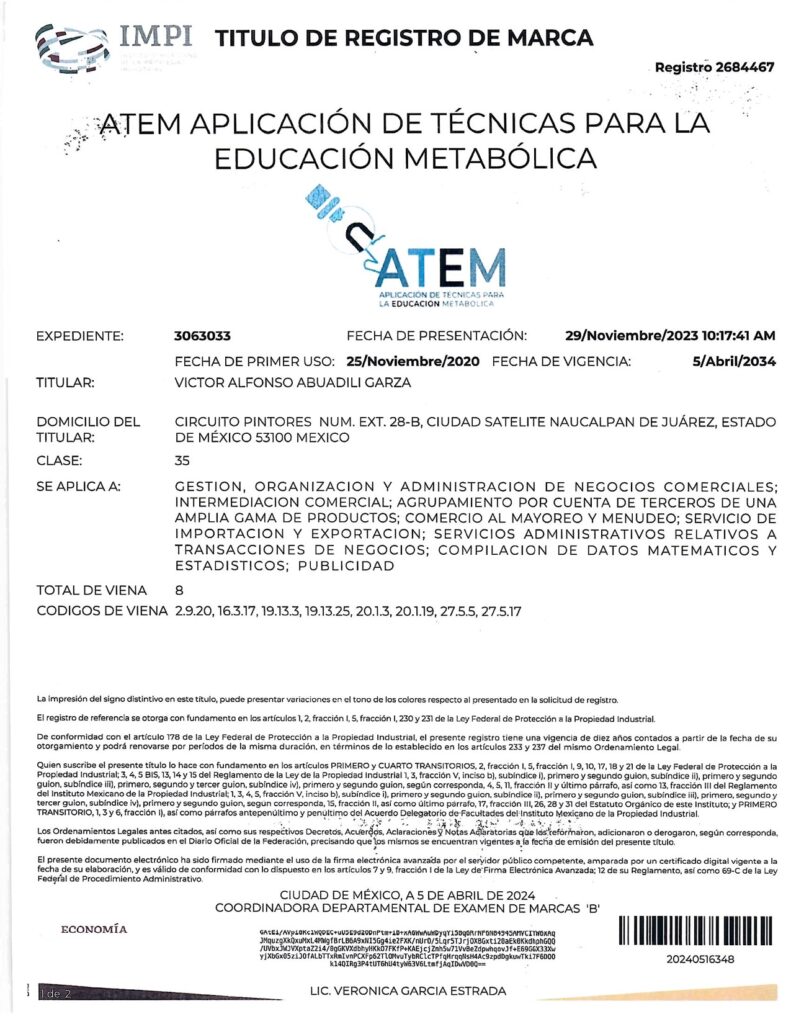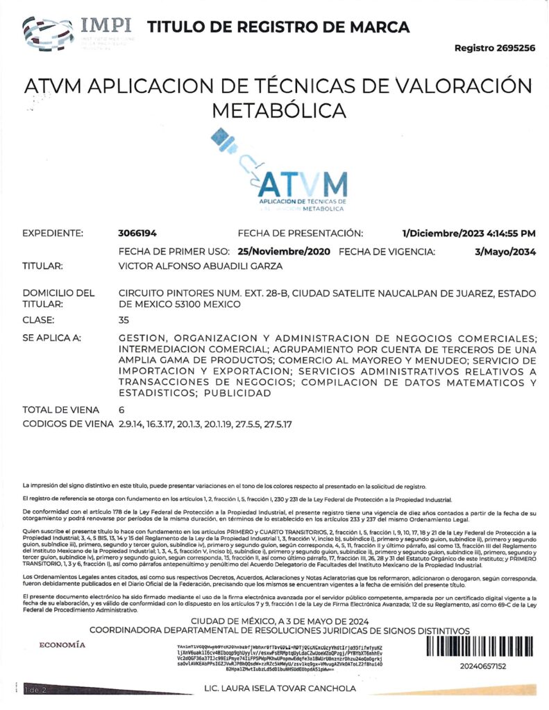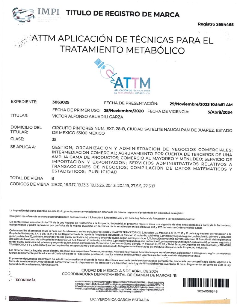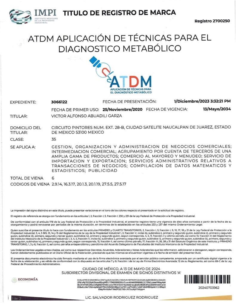 - CON EL REGISTRO 2687821 EN EL EXPEDIENTE 3060753 DEL IMPI, CUYO TITULAR ES: VICTOR ALFONSO ABUADILI GARZA, SE REGISTRA EL SISTEMA DE APLICACIÓN DE TÉCNICAS PARA EL DIAGNÓSTICO METABÓLICO (SISTEMA ATDM) EN LA CATEGORÍA 35: “GESTION, ORGANIZACIÓN Y ADMINISTRACIÓN DE NEGOCIOS COMERCIALES; INTERMEDIACIÓN COMERCIAL; AGRUPAMIENTO POR CUENTA DE TERCEROS DE UNA AMPLIA GAMA DE PRODUCTOS; COMERCIO AL MAYOREO Y MENUDEO; SERVICIOS DE IMPORTACIÓN Y EXPORTACIÓN; SERVICIOS ADMINISTRATIVOS RELATIVOS A TRANSACCIONES DE NEGOCIOS; COMPILACIÓN DE DATOS MATEMÁTICOS Y ESTADÍSTICOS; PUBLICIDAD”.