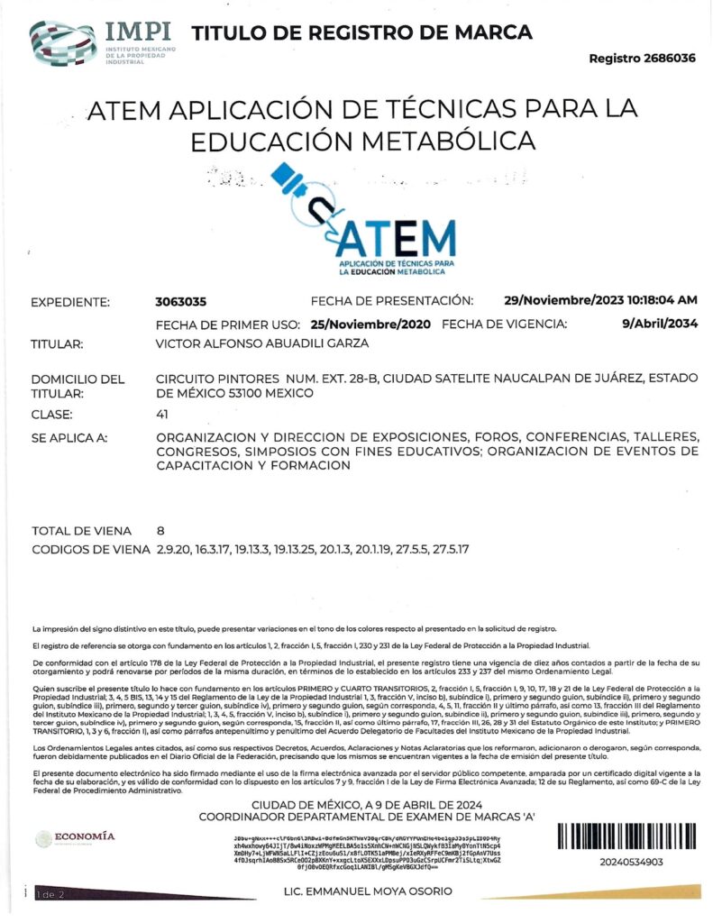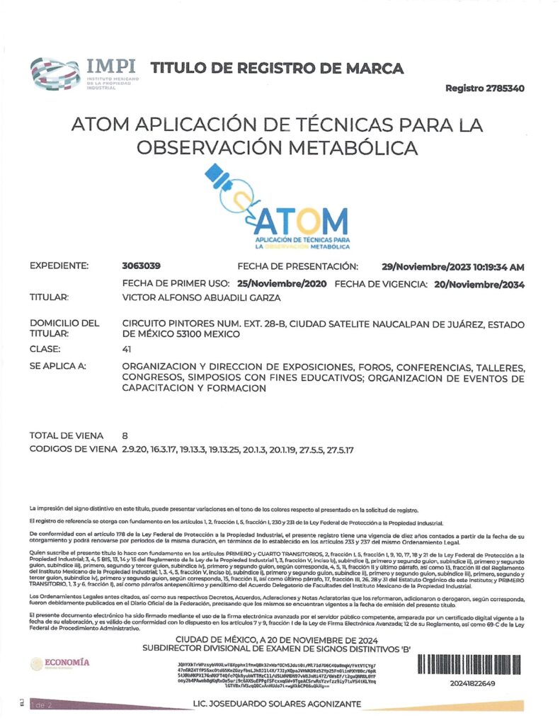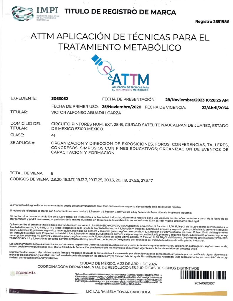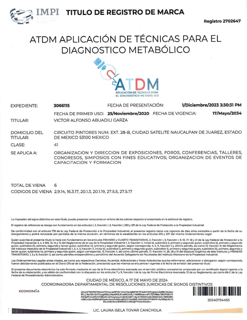- CON EL REGISTRO 2692283 EN EL EXPEDIENTE 3060754 DEL IMPI, CUYO TITULAR ES: VICTOR ALFONSO ABUADILI GARZA, SE REGISTRA EL SISTEMA DE APLICACIÓN DE TÉCNICAS PARA EL DIAGNÓSTICO METABÓLICO (SISTEMA ATDM) EN LA CATEGORÍA 41: “ORGANIZACIÓN Y DIRECCIÓN DE EXPOSICIONES, FOROS, CONFERENCIAS, TALLERES, CONGRESOS, SIMPOSIOS CON FINES EDUCATIVOS; ORGANIZACIÓN DE EVENTOS DE CAPACITACIÓN Y FORMACIÓN”.