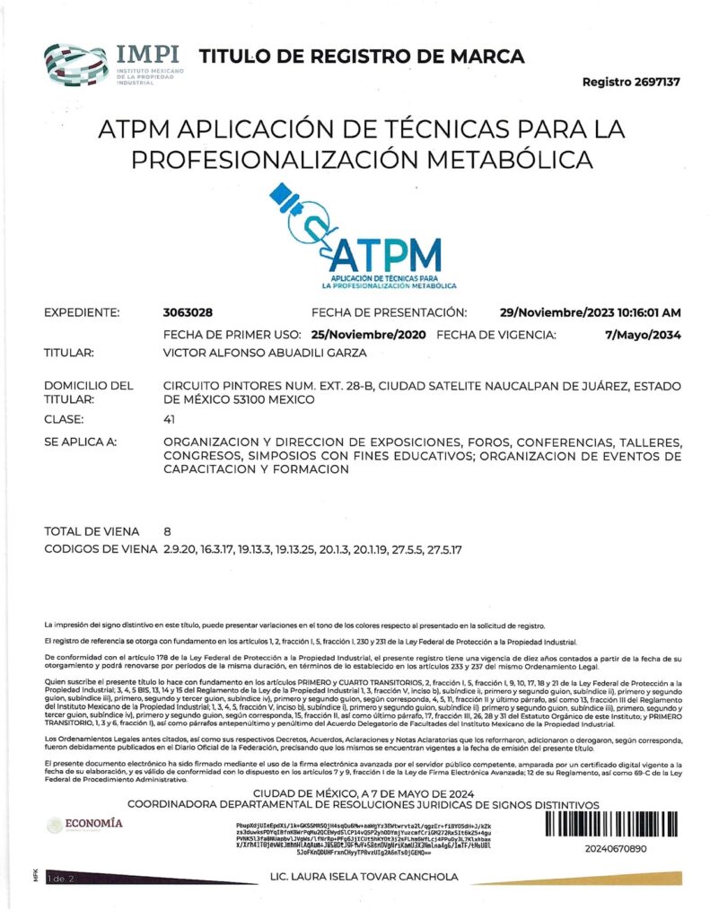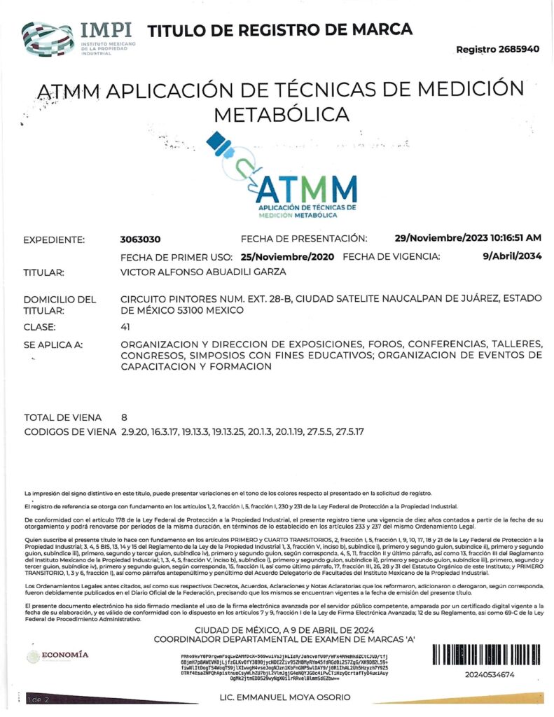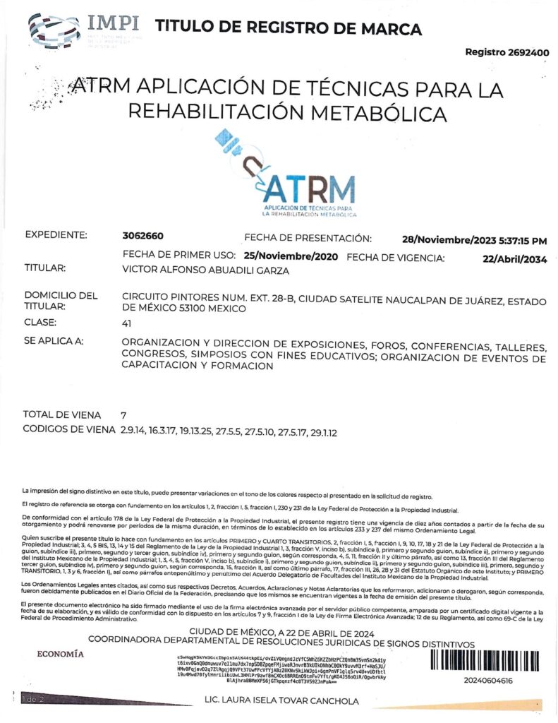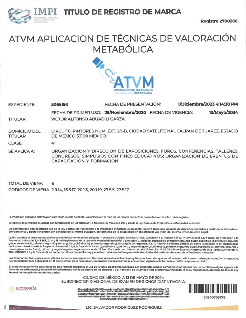 - CON EL REGISTRO 2692283 EN EL EXPEDIENTE 3060754 DEL IMPI, CUYO TITULAR ES: VICTOR ALFONSO ABUADILI GARZA, SE REGISTRA EL SISTEMA DE APLICACIÓN DE TÉCNICAS PARA EL DIAGNÓSTICO METABÓLICO (SISTEMA ATDM) EN LA CATEGORÍA 41: “ORGANIZACIÓN Y DIRECCIÓN DE EXPOSICIONES, FOROS, CONFERENCIAS, TALLERES, CONGRESOS, SIMPOSIOS CON FINES EDUCATIVOS; ORGANIZACIÓN DE EVENTOS DE CAPACITACIÓN Y FORMACIÓN”.