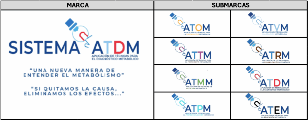 CADA PARTE DEL SISTEMA DE APLICACIÓN DE TÉCNICAS PARA EL DIAGNÓSTICO METABÓLICO (SISTEMA ATDM), TIENE DEBIDAMENTE REGISTRADA LA MARCA PRINCIPAL, ASÍ COMO CADA UNA DE LAS SUBMARCAS ASOCIADAS A TODO NUESTRO SISTEMA, MISMOS QUE A CONTINUACIÓN TE DAMOS A CONOCER PÚBLICAMENTE: